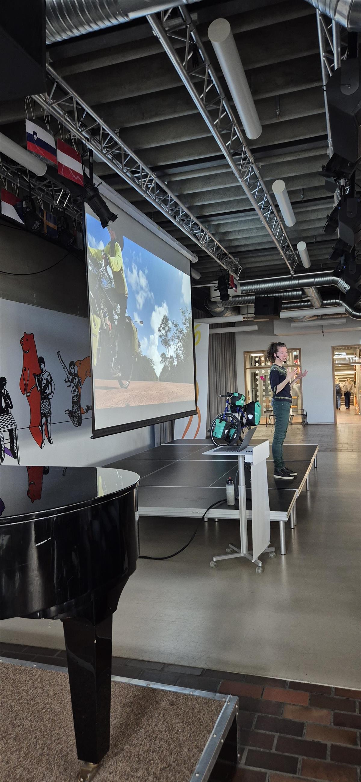 Geografiklassene fikk høre hennes egne fortellinger fra turen, om sterke menneskemøter og en eventyrlig ferd på to hjul gjennom ulike klimasoner og områder med ulike levekår. Om sykling i både sandstorm og snøstorm, og gripende beretninger om hvordan hun møtte gjestfrihet, raushet og rike møter med folk i de fattigste områdene på jorden. Sykkelen på scenen, den samme som holdt det gående hele turen, så klar ut for nye eventyr!