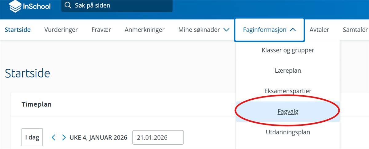 Prøvevalget av programfag gjennomføres ved å logge inn på InSchool, og velge Faginformasjon > Fagvalg.